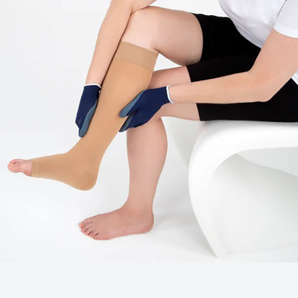 High-quality textile gloves with a latex surface providing a good grip when putting on and taking off compression stockings.